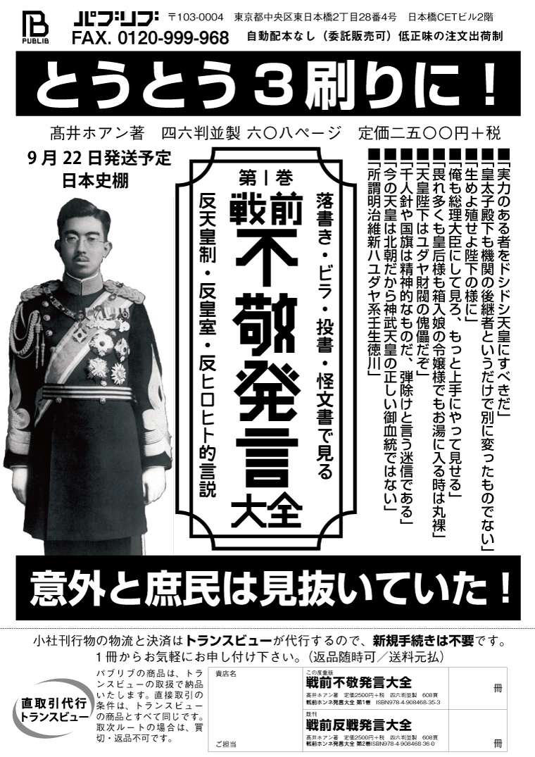 ドシ天で知られる『戦前不敬発言大全』ですが、とうとう3刷りする事になりました。
